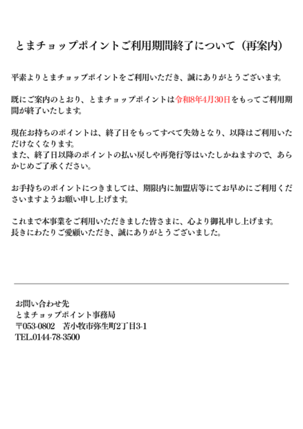 【再案内】とまチョップポイントご利用期間終了について