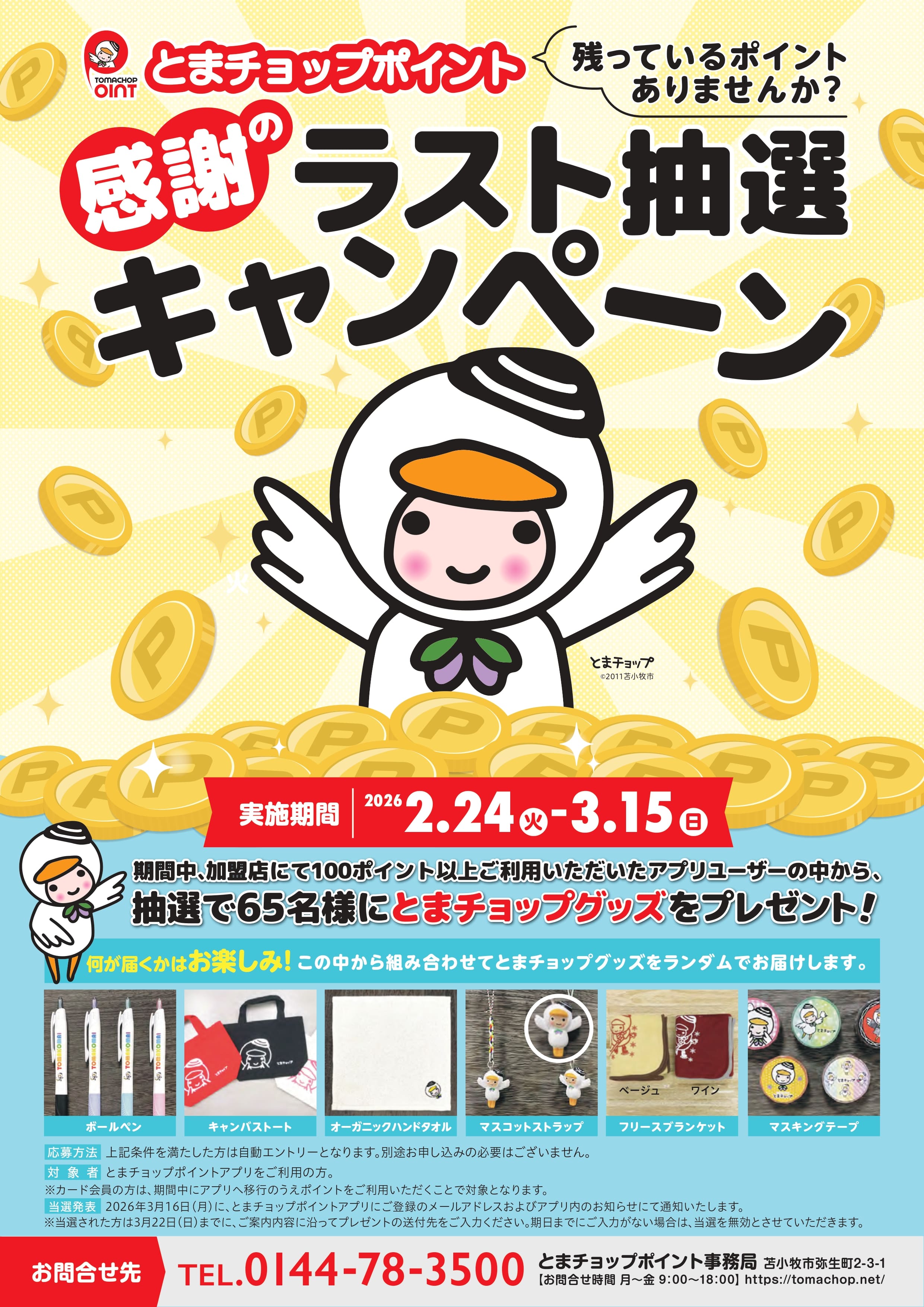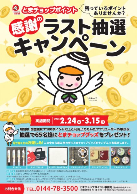 当選発表:2026年3月16日(月)に、とまチョップポイントアプリにご登録のメールアドレスおよびアプリ内のお知らせにて通知いたします。